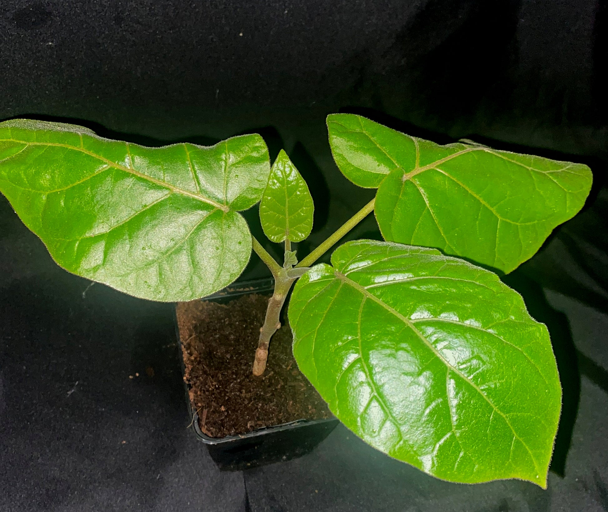 We grow tree tomatoes mainly for their huge hairy heart shaped foliage. They are fast growing, making impressive plants in their first summer outdoors. Can either be grown in pots or planted out until the first frosts. The fruits are egg shaped, forming usually in autumn. Not tricky to overwinter if kept frost free.